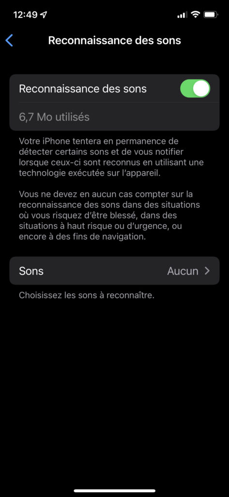 Il s’agit donc d’une fonction d’accessibilité permettant aux personnes souffrant de problèmes auditifs d’être alertées lorsqu’un son demandant une attention est reconnu. L’option peut également être utile lorsque vous écoutez de la musique avec un casque par exemple.